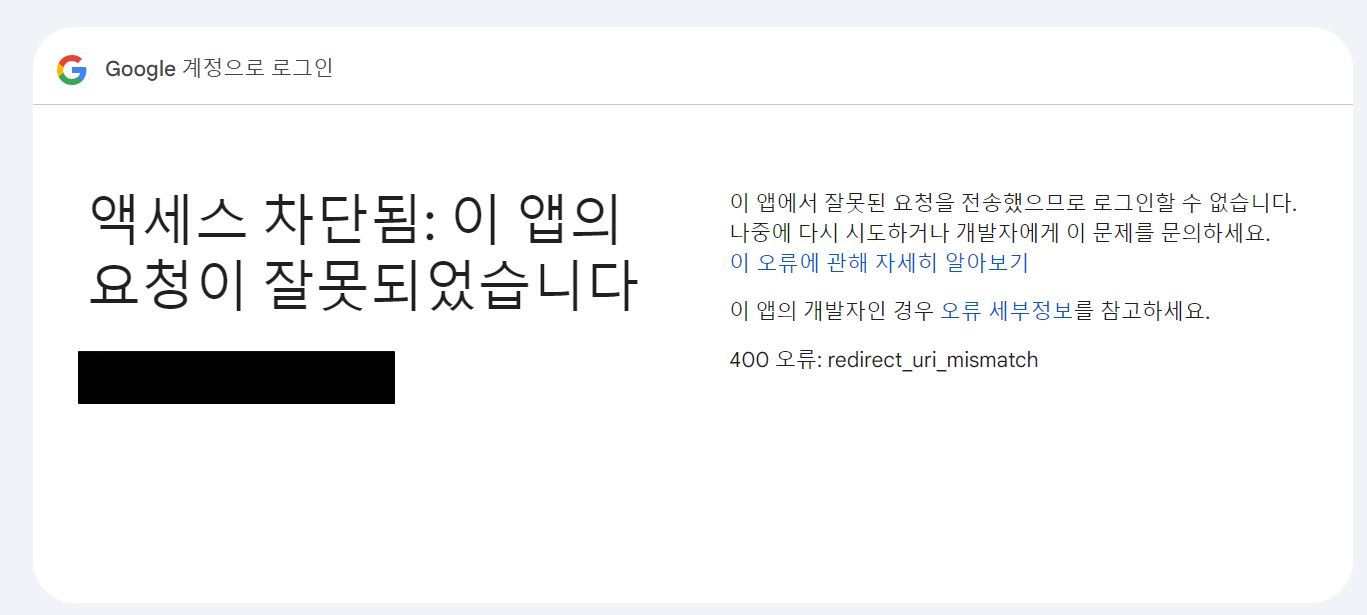 문제- 구성한 endpoint가 잘 동작하는지 테스트해보니 아래처럼 400 오류가 난다. (redirect_uri_mismatch) 해결일단 나는 두가지를 수정 했고, 이후 정상적으로 동작하는 것 확인했다.1. oauth client id 발급