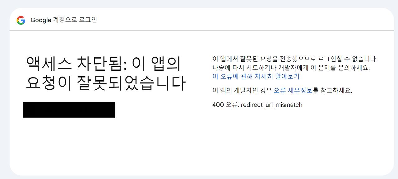 - 구성한 endpoint가 잘 동작하는지 테스트해보니 아래처럼 400 오류가 난다. (redirect_uri_mismatch)