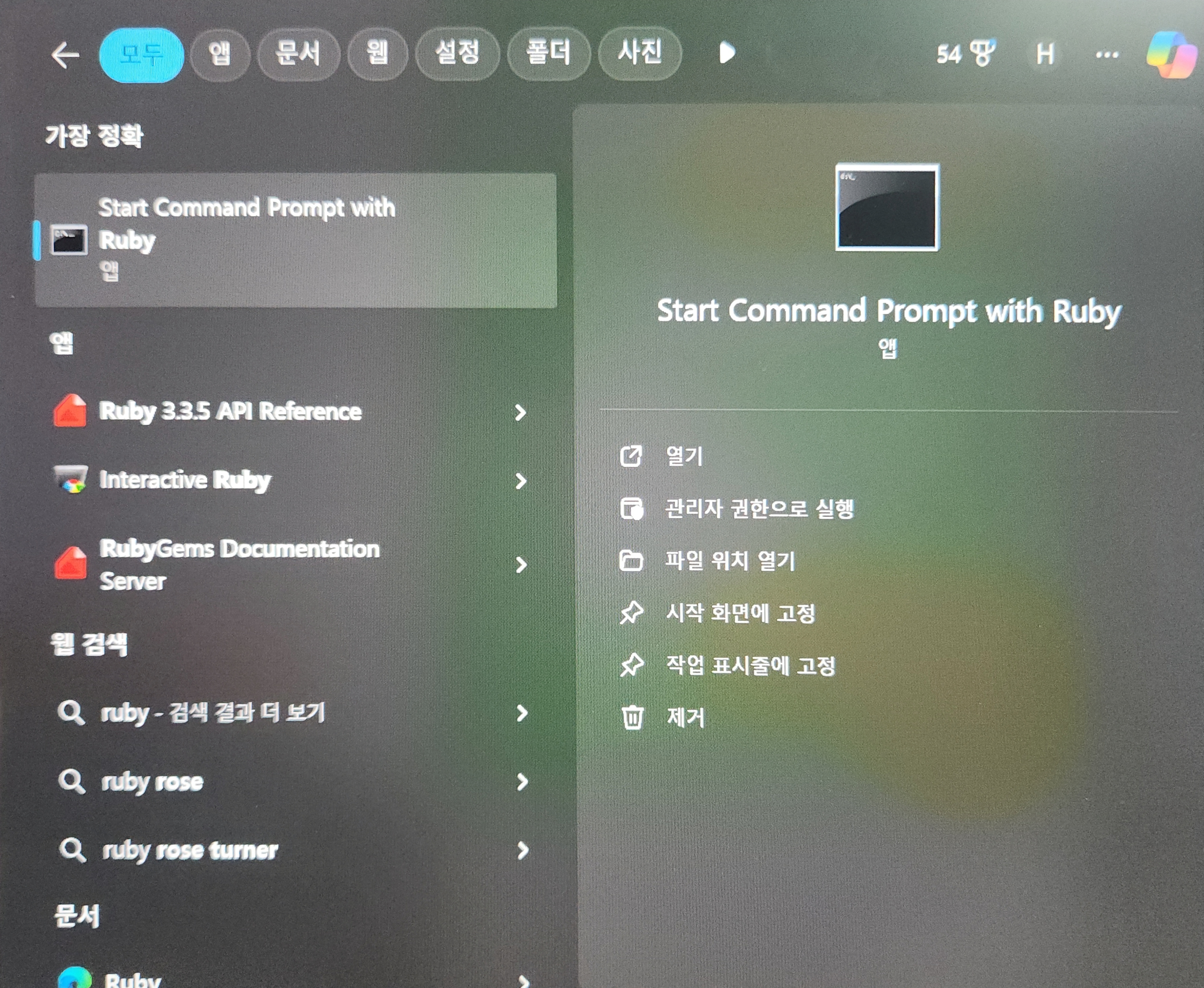 작업표시줄 검색 상자에 Start Command Prompt with Ruby 검색 및 실행