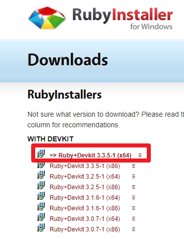 https://rubyinstaller.org/downloads/ 에서 최신 버전 받아서 설치
