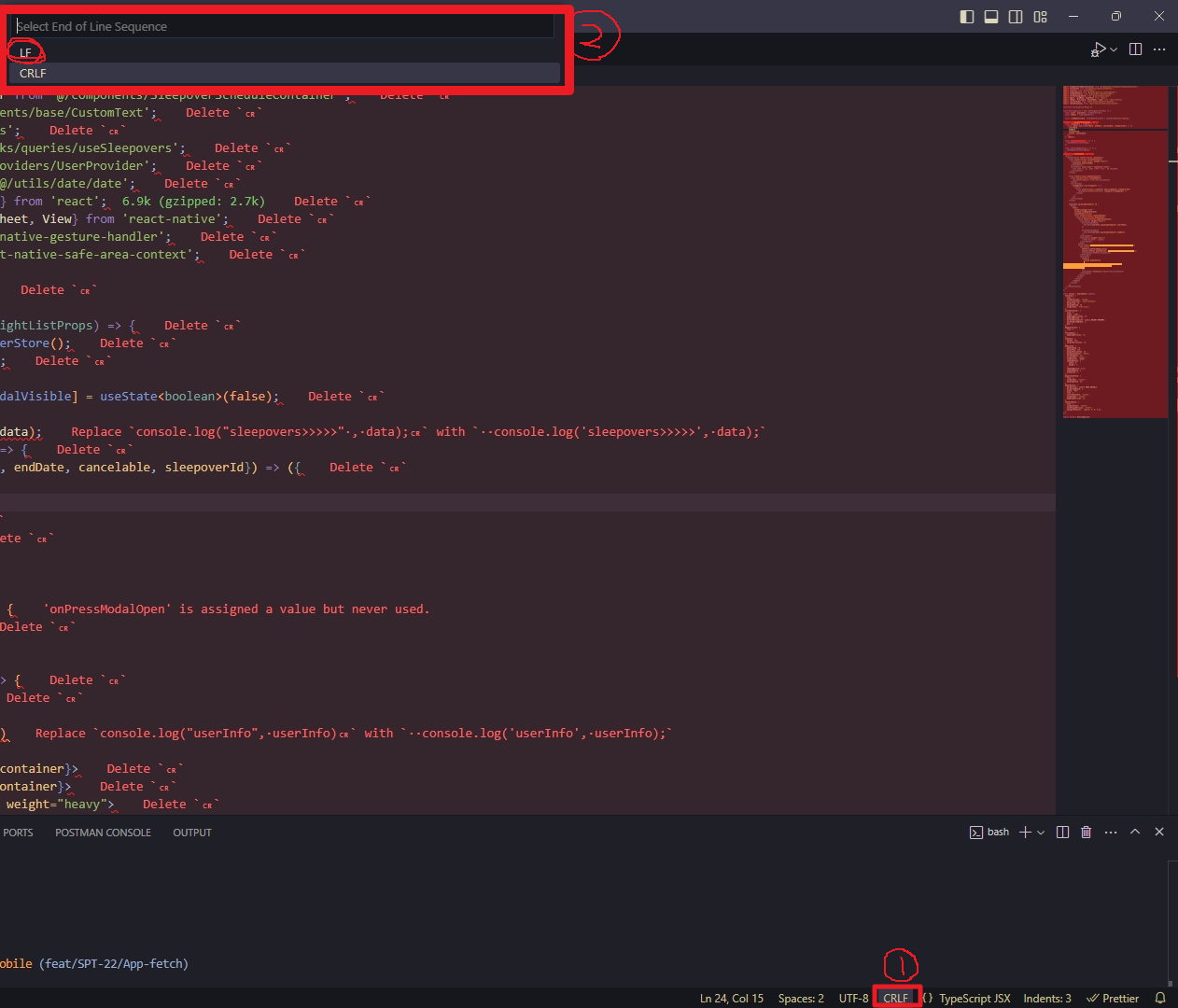 1. vscode 우측 하단의 CRLF 설정을 LF 으로 변경