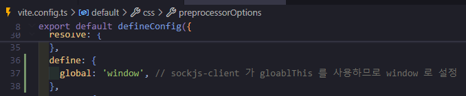 ![]() vite.config.js 에 global 참조 오류 안나도록 선언 추가 |