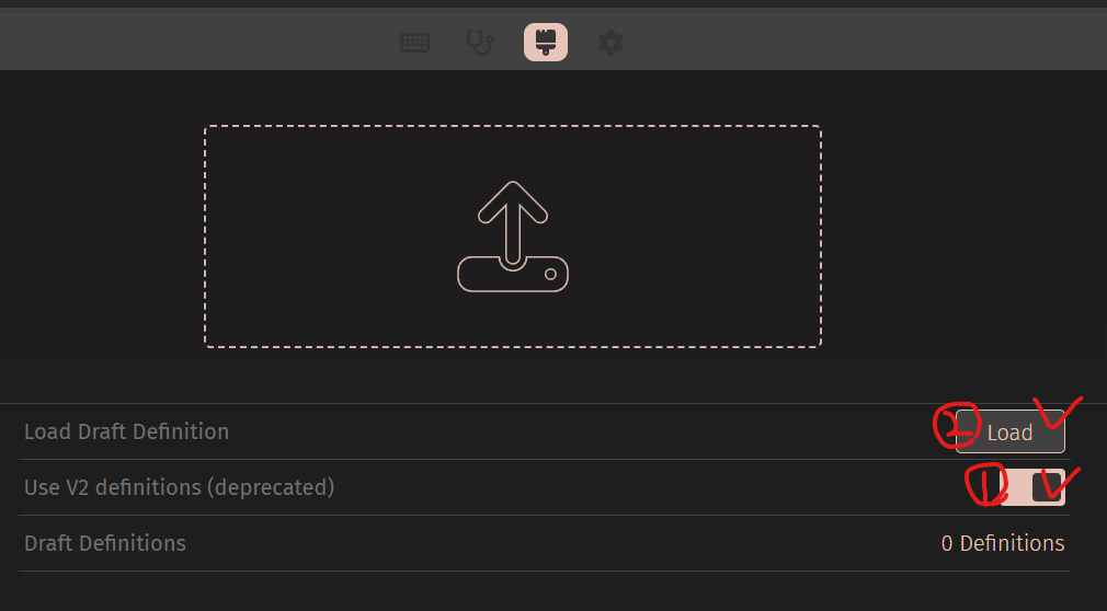 3. use v2 definitions 토글 버튼 on + load draft definition 버튼을 클릭해, 1번에서 다운받은 파일을 업로드한다.
