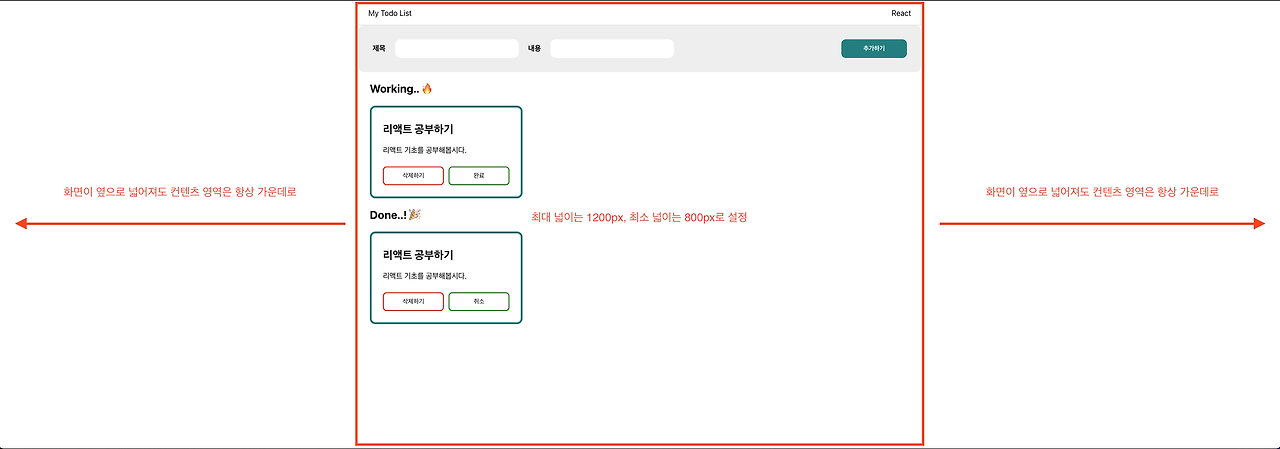 - Layout의 최대 너비는 1200px, 최소 너비는 800px로 제한하고, 전체 화면의 가운데로 정렬해주세요.