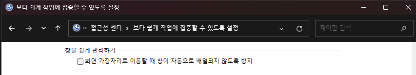: 제어판 > 접근성 센터 > 보다 쉽게 작업에 집중할 수 있도록 설정 > 창을 쉽게 관리하기 > 화면 가장자리로 이동할 때 창이 자동으로 배열되지 않도록 방지 체크 해제