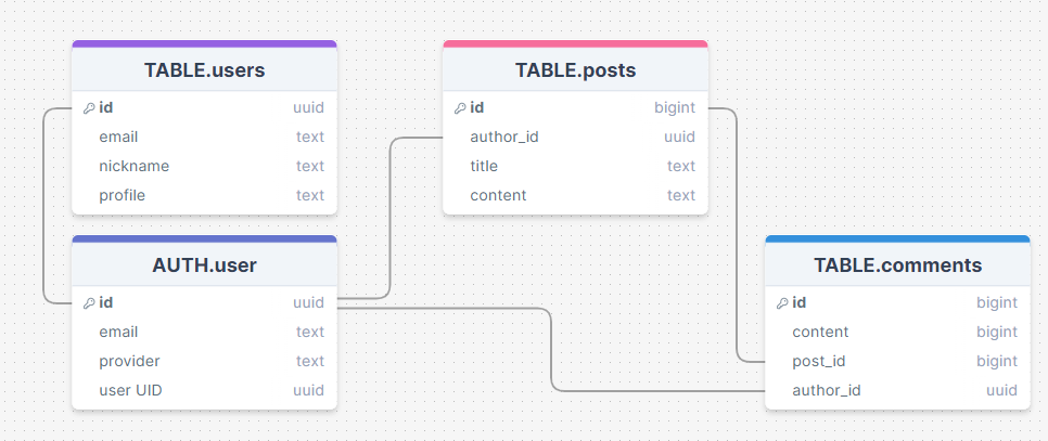 supabase에서 제공하는 Auth, 사용자 정보는 table 제공되지 않아, 프로필 이미지를 저장하기 위해 user 테이블을 생성해 Auth.userId만 조인해서 사용중이였다. 다만, 다른 테이블(posts, comments)에 걸려있는 사용자 아이디도 Auth의 userId를 조인해서 사용 중이였는데 이것이 문제였다.